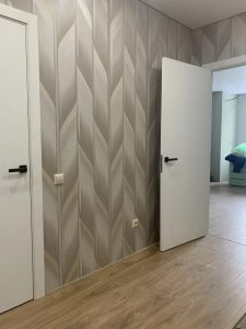 Межкомнатная дверь с черной алюминиевой кромкой с 4 — ёх сторон, с врезкой под скрытые петли и магнитный замок. Так же возможно изготовление с обычной кромкой, без врезок.